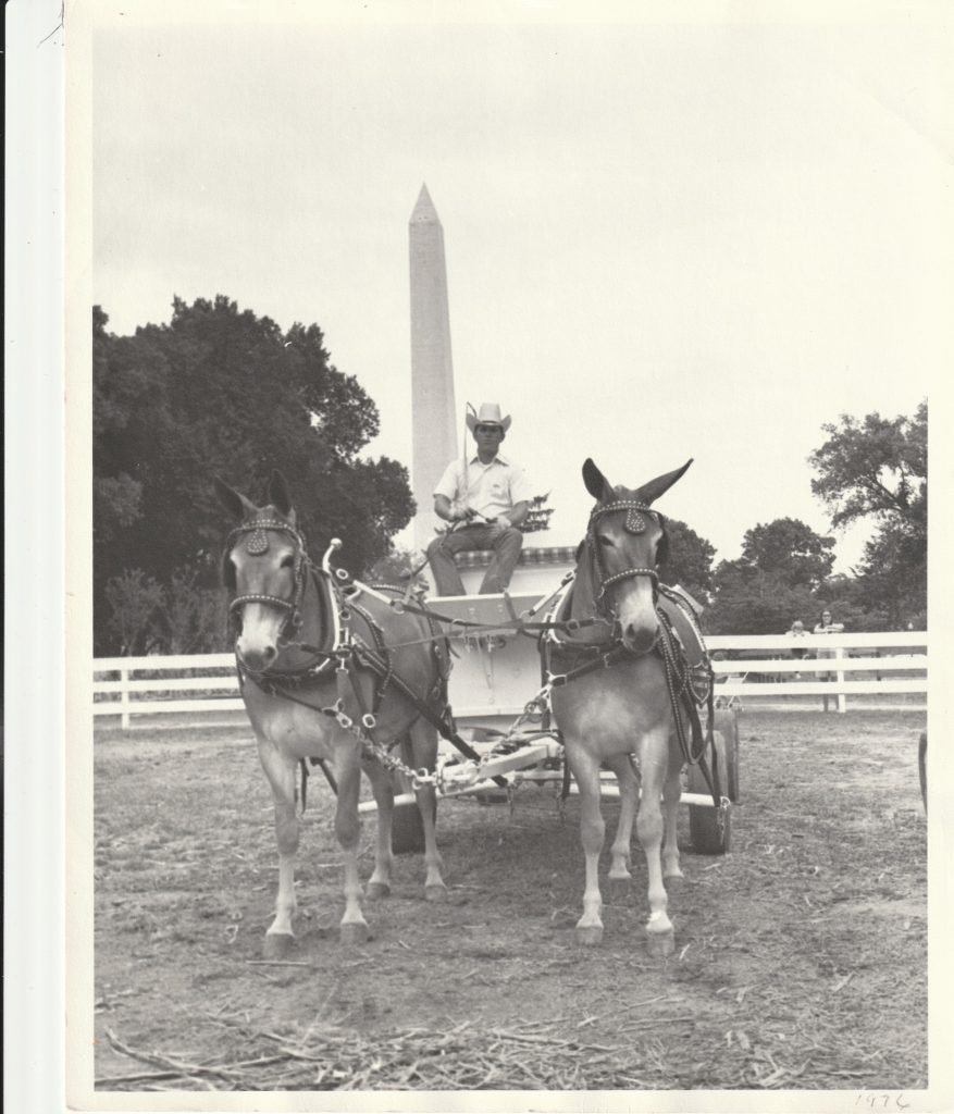 Show Day was always Tuesday, and people came from all over the state to see the mules perform. The showmen had big whips with crackers to get the mules’ attention, and no, there was no whipping the mules! There were also 12-inch show sticks, soda cans with rocks, connector straps, and extra lead straps so they could show more than one mule at a time.